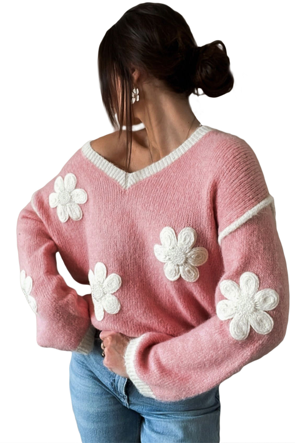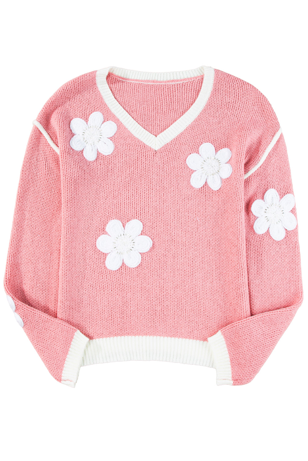 Pink Floral Patched Contrast Trim V Neck Sweater
