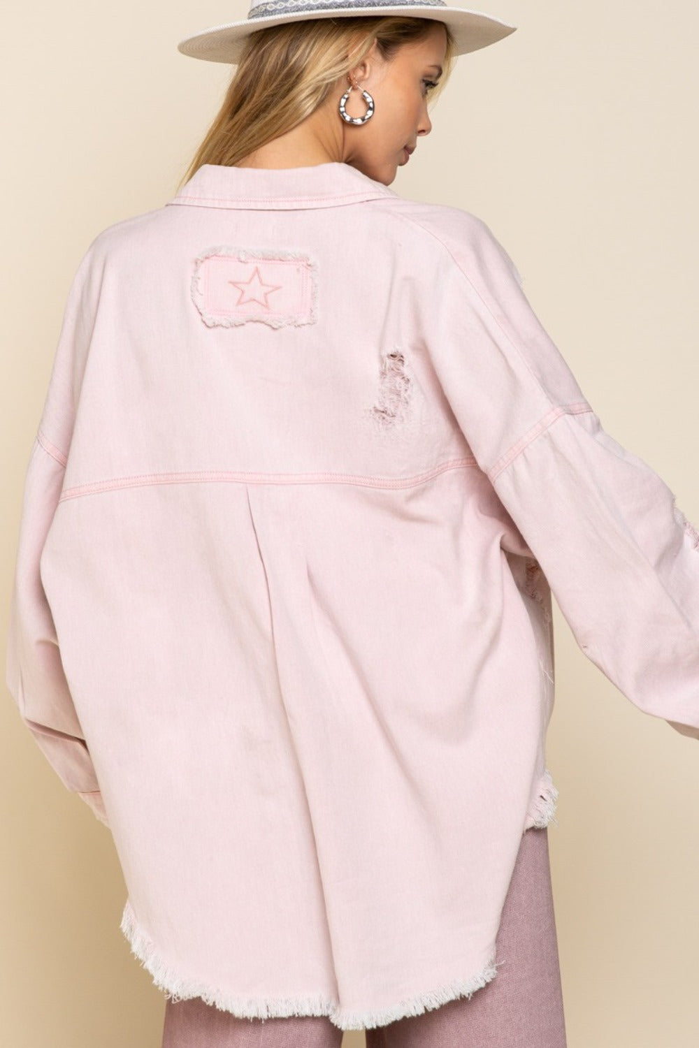 The Button Down Raw Hem Distressed Shacket is a versatile and edgy piece that combines the style of a shirt with the functionality of a jacket. The raw hem and distressed detailing give it a rugged and worn-in look for added character. With a button-down front, this shacket can be worn open as a lightweight layer or closed as a standalone top. The combination of a shirt and jacket makes it perfect for transitional weather and layering over your favorite outfits. Pair it with jeans and boots for a casual and on-trend ensemble. Elevate your streetwear style with this cool and fashion-forward distressed shacket.